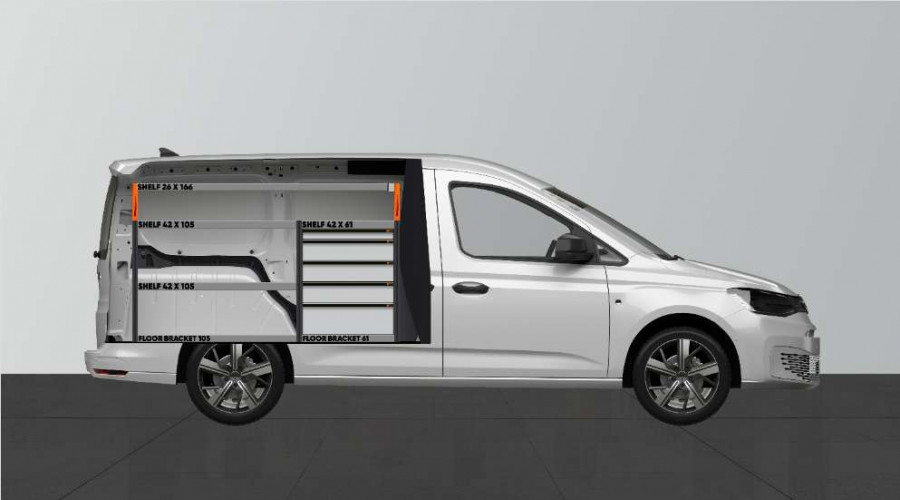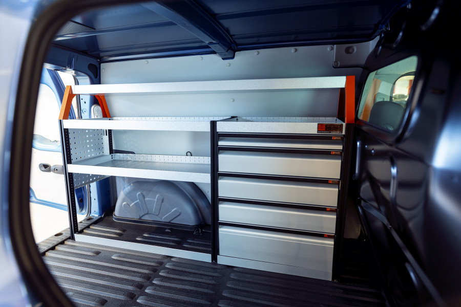 Mit dieser Fahrzeugeinrichtung erhalten Sie viel Stauraum in Regalen und Schubladen, geeignet für den VW Caddy Cargo & Ford Connect L2.