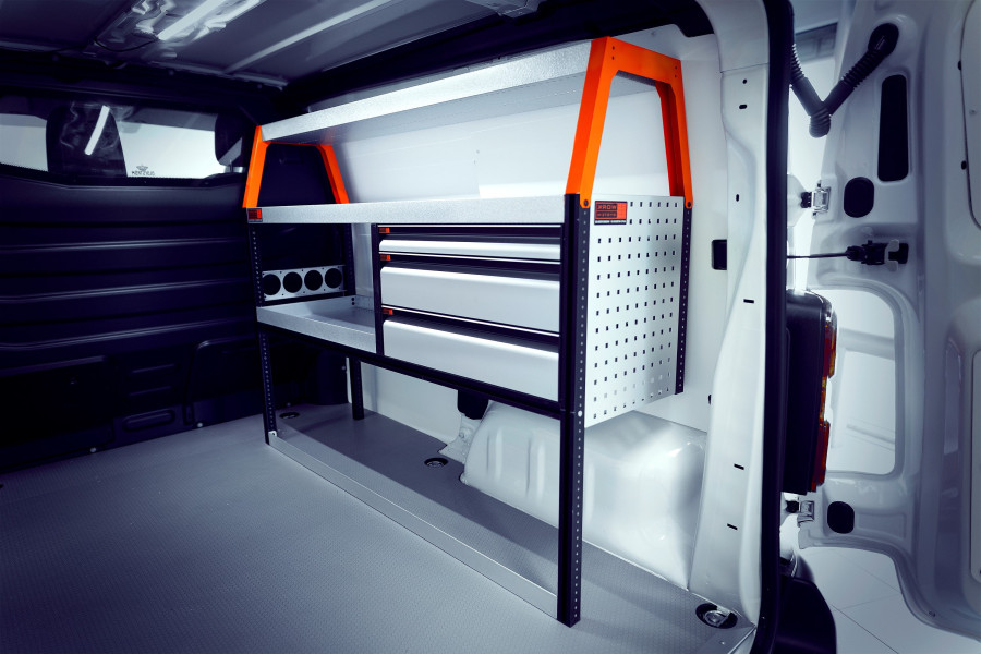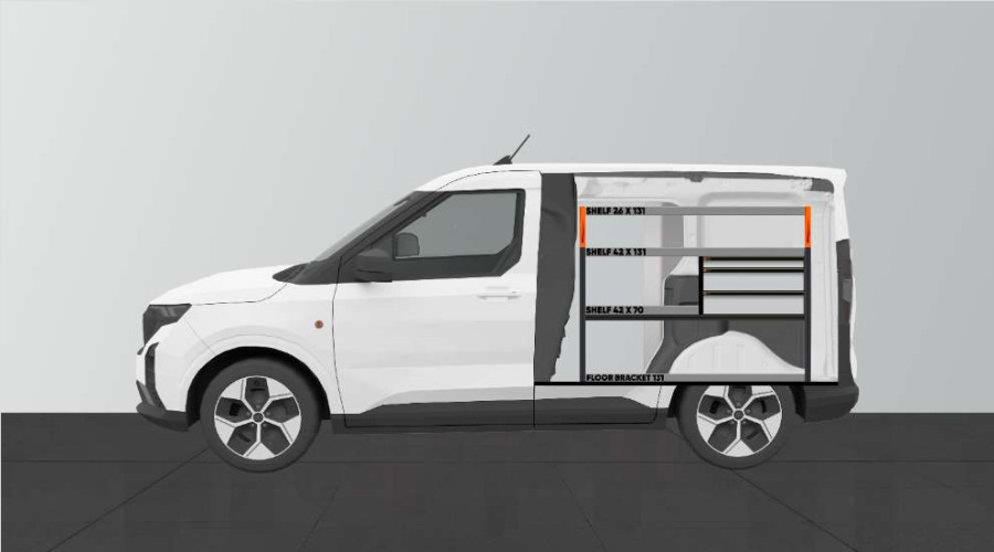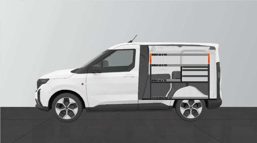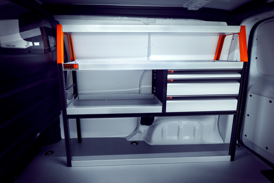 Dies ist eine unserer beliebtesten Fahrzeugeinrichtungen für den Ford Courier L1. LS3 – Die Einrichtung wird u. a. von Hausmeistern, Servicetechnikern, Elektrikern, Heizungs- und Sanitärinstallateuren und Tischlern genutzt. Die Einrichtung bietet gute Aufbewahrungsmöglichkeiten für Werkzeugtaschen/-koffer, Maschinen, Verbrauchsmaterialien und Ihr Kleinteilsortiment. Die Schubladen werden oft durch unsere Schubladeneinsätze und Trennwände ergänzt. An den Regalwänden lässt sich durch unsere Smartboxen zusätzliche Staufläche gewinnen.