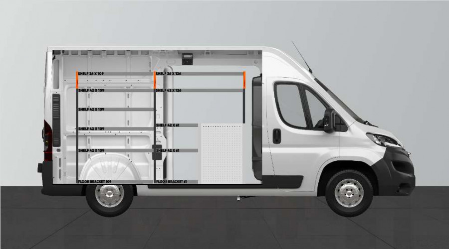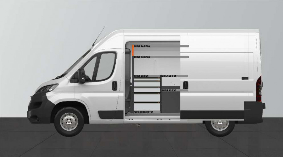 Dies ist eines der beliebtesten Systeme für den Proace Max, Peugeot Boxer, Fiat Ducato, Citroen Jumper 2010- & Opel Movano 2021- L2 mit Seitentür auf der Seite der Einrichtung. Die Einrichtung bietet gute Aufbewahrungsmöglichkeiten für Werkzeugtaschen/-koffer, Maschinen und Kleinteile. Sie umfasst eine Schubladeneinheit mit 5 Schubladen in verschiedenen Größen, damit jeder Ausrüstungsgegenstand seinen Platz erhält. Hinter den Schubladen befindet sich eine Werkzeugtafel, die zusätzliche Aufhängungsmöglichkeiten im Fahrzeug bietet. Die Schubladen auf Kugellagerschienen werden häufig durch unsere neuen Schubladeneinsätze und Trennwände ergänzt, um maximale Ordnung und Übersichtlichkeit zu gewährleisten. Die Regalwand wird gerne auch durch unsere Smartboxen ergänzt, um den Stauraum zu maximieren.