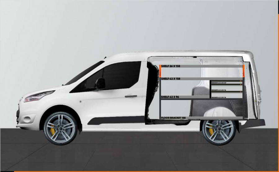 Dies ist eine unserer beliebtesten Fahrzeugeinrichtungen für den Ford Connect L2. LS3 – Die Einrichtung wird u. a. von Hausmeistern, Servicetechnikern, Elektrikern, Heizungs- und Sanitärinstallateuren und Tischlern genutzt. Die Einrichtung bietet gute Aufbewahrungsmöglichkeiten für Werkzeugtaschen/-koffer, Maschinen, Verbrauchsmaterialien und Ihr Kleinteilsortiment. Die Schubladen werden oft durch unsere Schubladeneinsätze und Trennwände ergänzt. An den Regalwänden lässt sich durch unsere Smartboxen zusätzliche Staufläche gewinnen.