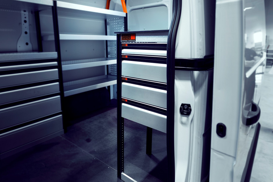 Eines der beliebstesten Fahrzeugregel für Ihren Maxus e-Deliver 9 L2. Die Einrichtung bietet vielfältige Aufbewahrungsmöglichkeiten, da die Schubladen auf Kugellagerschienen einen einfachen Zugang über die Seitentür bieten; die Schubladen können in Fahrtrichtung herausgezogen werden, um eine gute Übersichtlichkeit zu bieten. Die Schubladen können um Trennwände ergänzt werden, um mehr Ordnung und Struktur beim Kleinteilsortiment zu schaffen. Unsere tiefen Regalböden bieten außerdem gute Aufbewahrungsmöglichkeiten für Werkzeugtaschen/-koffer und kleinere Maschinen. Das verteilte Ladegewicht in den Schubladen der Kugellagerschienen beträgt 35 kg/St. Die Schubladen-Innenmaße sind B: 308, T: 387, H: 60 und H: 130 (mm).