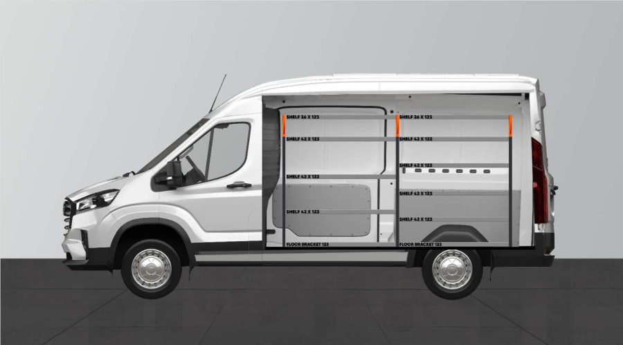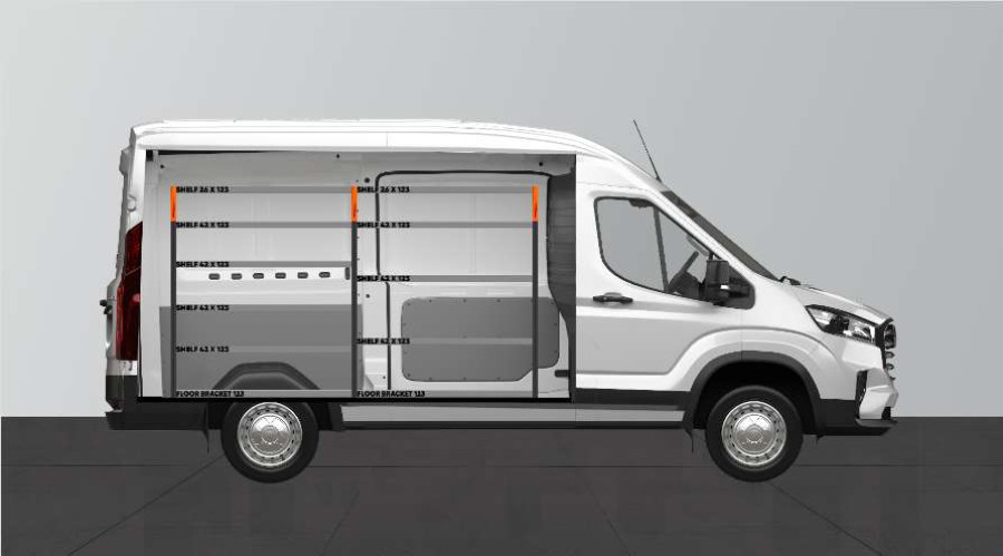 Eine Fahrzeugeinrichtung für Ihren Maxus e-Deliver9 L2, die gute Aufbewahrungsmöglichkeiten für Werkzeugtaschen/-koffer, Maschinen und Kleinteile bietet. Die Regalböden der Einrichtung haben eine Tiefe von 420 mm, dank derer sich die meisten auf dem Markt erhältlichen Werkzeugtaschen/-koffer problemlos verstauen lassen. Das obere Regal mit 262,5 mm wird oft durch unsere Modulboxen ergänzt, um Platz für die Aufbewahrung von Kleinteilen zu schaffen. Vergessen Sie nicht, die Werkzeugtafel der Regalwand zu nutzen.
