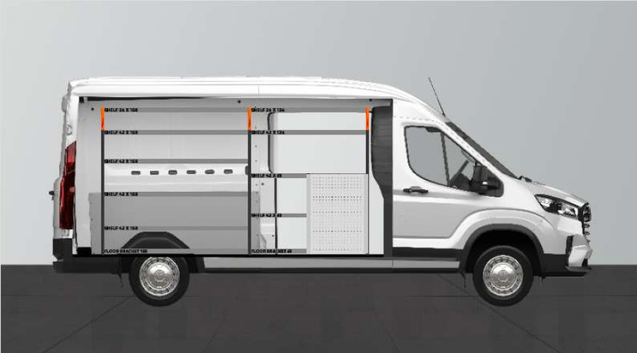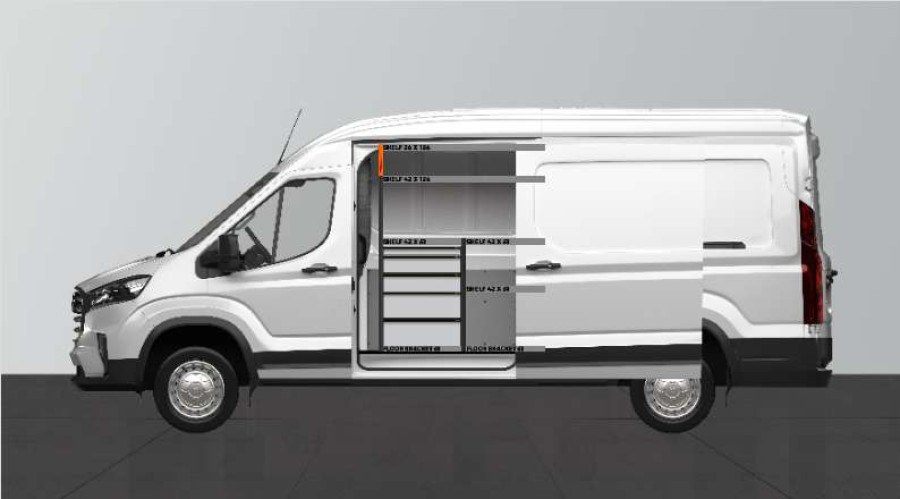 Mit dieser Fahrzeugeinrichtung erhalten Sie viel Stauraum in Regalen und Schubladen, geeignet für den Maxus e-Deliver9 L3. (Rücknahme/Umtausch ausgeschlossen)