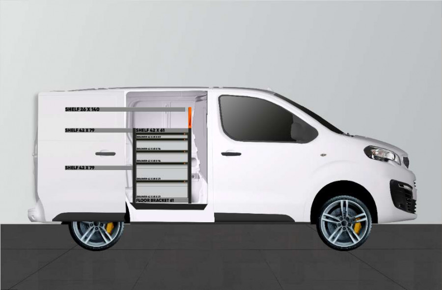 Dies ist eines der beliebtesten Systeme für den Peugeot Expert, Citroen Jumpy, Opel Vivaro, Fiat Scudo & Toyota ProAce mit Seitentür auf der Seite der Einrichtung. Die Einrichtung bietet gute Aufbewahrungsmöglichkeiten für Werkzeugtaschen/-koffer, Maschinen und Kleinteile. Sie umfasst eine Schubladeneinheit mit 5x Schubladen in verschiedenen Größen, damit jeder Ausrüstungsgegenstand seinen Platz erhält. Hinter den Schubladen befindet sich eine Werkzeugtafel, die zusätzliche Aufhängungsmöglichkeiten im Fahrzeug bietet. Die Schubladen auf Kugellagerschienen werden häufig durch unsere neuen Schubladeneinsätze und Trennwände ergänzt, um maximale Ordnung und Übersichtlichkeit zu gewährleisten. Die Regalwand wird gerne auch durch unsere Smartboxen ergänzt, um den Stauraum zu maximieren.