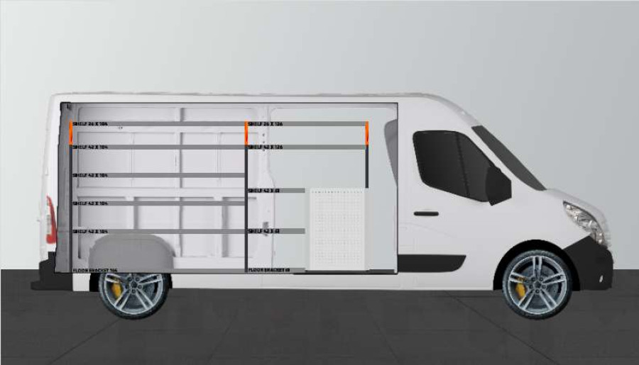 Dies ist eines der beliebtesten Systeme für den Opel Movano, Renault Master & Nissan NV400 L3 mit Seitentür auf der Seite der Einrichtung. Die Einrichtung bietet gute Aufbewahrungsmöglichkeiten für Werkzeugtaschen/-koffer, Maschinen und Kleinteile. Sie umfasst eine Schubladeneinheit mit 5 Schubladen in verschiedenen Größen, damit jeder Ausrüstungsgegenstand seinen Platz erhält. Hinter den Schubladen befindet sich eine Werkzeugtafel, die zusätzliche Aufhängungsmöglichkeiten im Fahrzeug bietet. Die Schubladen auf Kugellagerschienen werden häufig durch unsere neuen Schubladeneinsätze und Trennwände ergänzt, um maximale Ordnung und Übersichtlichkeit zu gewährleisten. Die Regalwand wird gerne auch durch unsere Smartboxen ergänzt, um den Stauraum zu maximieren.