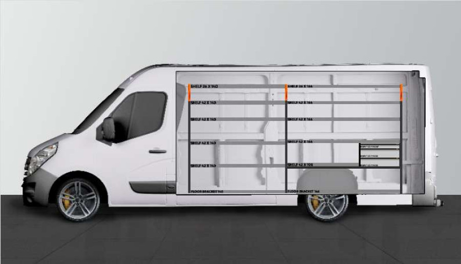 Dies ist eine unserer beliebtesten Fahrzeugeinrichtungen für den Opel Movano, Renault Master & Nissan NV400 L3. LS3 – Die Einrichtung wird u. a. von Hausmeistern, Servicetechnikern, Elektrikern, Heizungs- und Sanitärinstallateuren und Tischlern genutzt. Die Einrichtung bietet gute Aufbewahrungsmöglichkeiten für Werkzeugtaschen/-koffer, Maschinen, Verbrauchsmaterialien und Ihr Kleinteilsortiment. Die Schubladen werden oft durch unsere Schubladeneinsätze und Trennwände ergänzt. An den Regalwänden lässt sich durch unsere Smartboxen zusätzliche Staufläche gewinnen.