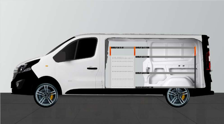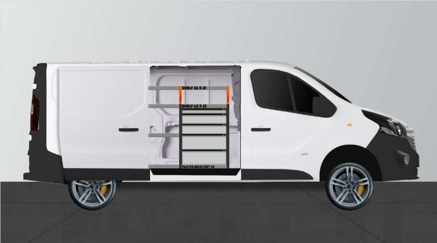 Dies ist eines der beliebtesten Systeme für den Nissan NV300, Renault Trafic & Fiat Talento L2 mit Seitentür auf der Seite der Einrichtung. Die Einrichtung bietet gute Aufbewahrungsmöglichkeiten für Werkzeugtaschen/-koffer, Maschinen und Kleinteile. Sie umfasst eine Schubladeneinheit mit 5 Schubladen in verschiedenen Größen, damit jeder Ausrüstungsgegenstand seinen Platz erhält. Hinter den Schubladen befindet sich eine Werkzeugtafel, die zusätzliche Aufhängungsmöglichkeiten im Fahrzeug bietet. Die Schubladen auf Kugellagerschienen werden häufig durch unsere neuen Schubladeneinsätze und Trennwände ergänzt, um maximale Ordnung und Übersichtlichkeit zu gewährleisten. Die Regalwand wird gerne auch durch unsere Smartboxen ergänzt, um den Stauraum zu maximieren.