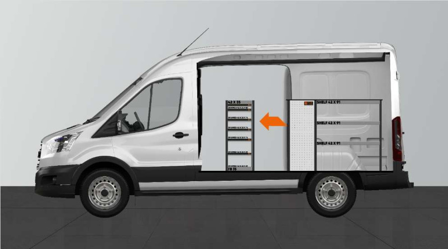 Wenn Sie eine Werkbank in Ihrem Ford Transit L2H2benötigen, ist diese Einrichtung eine flexible Kombination aus Regalfächern und herausziehbaren Schubladen, die Sie bequem von der Seitentür Ihres Fahrzeugs aus erreichen können. Die Werkbank besteht aus 12 mm starkem Kompaktlaminat, das sehr hart und strapazierfähig ist.