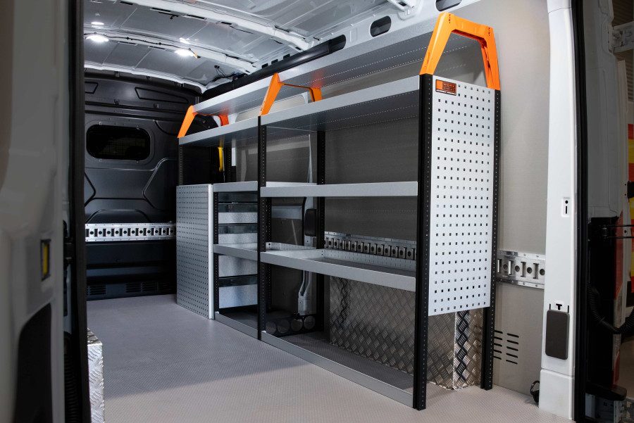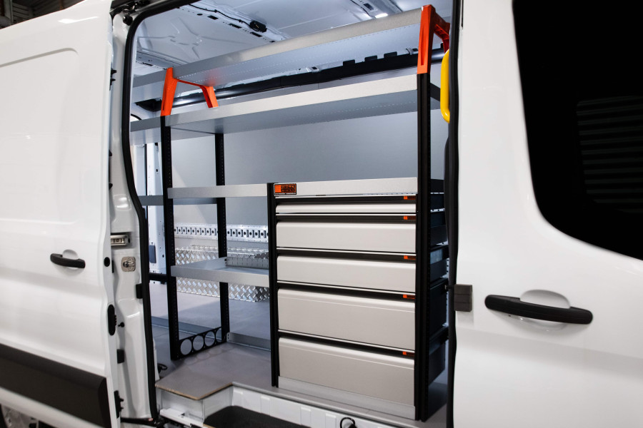 Dies ist eines der beliebtesten Systeme für den Ford Transit L3H2 mit Seitentür auf der Seite der Einrichtung. Die Einrichtung bietet gute Aufbewahrungsmöglichkeiten für Werkzeugtaschen/-koffer, Maschinen und Kleinteile. Sie umfasst eine Schubladeneinheit mit 5 Schubladen in verschiedenen Größen, damit jeder Ausrüstungsgegenstand seinen Platz erhält. Hinter den Schubladen befindet sich eine Werkzeugtafel, die zusätzliche Aufhängungsmöglichkeiten im Fahrzeug bietet. Die Schubladen auf Kugellagerschienen werden häufig durch unsere neuen Schubladeneinsätze und Trennwände ergänzt, um maximale Ordnung und Übersichtlichkeit zu gewährleisten. Die Regalwand wird gerne auch durch unsere Smartboxen ergänzt, um den Stauraum zu maximieren.
