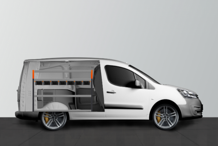Un aménagement utilitaire conçu pour ceux décidés dès le départ à garder leurs Citroën Berlingo et Peugeot Partner L2 H1 bien organisés et bien rangés. Il est équipé de sept de nos nouveaux bacs modulaires intelligents que vous pouvez extraire facilement le long de rails prévus à cet effet. Vous pouvez également ajuster et déplacer ces bacs à votre gré le long des rayonnages. Vous disposez ainsi d’excellentes possibilités de rangement pour vos mallettes d’outils, votre outillage électroportatif et votre équipement, car les étagères ont une profondeur de 420 mm.