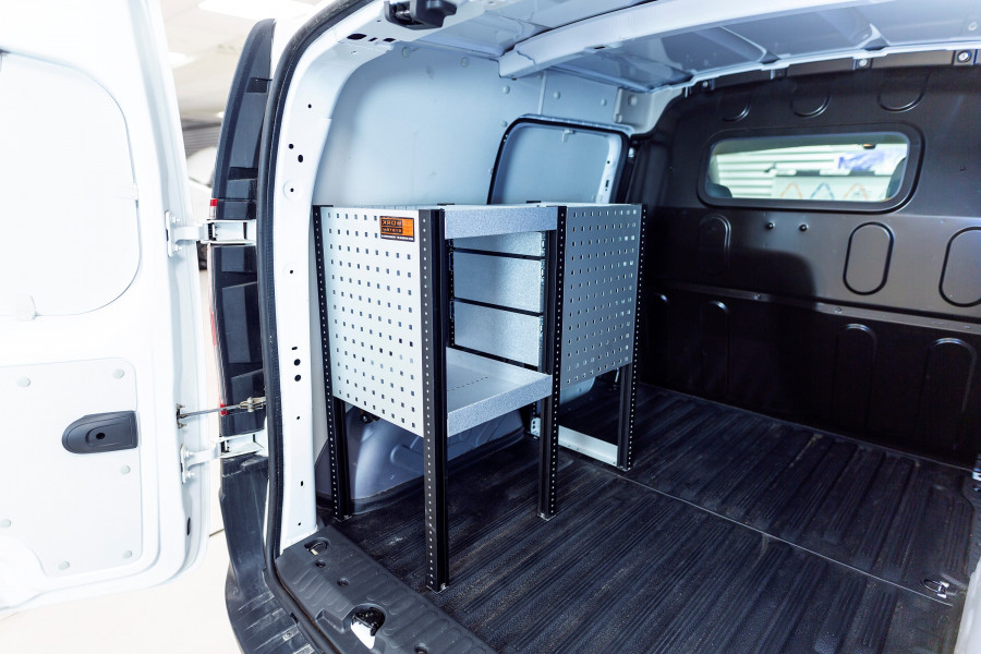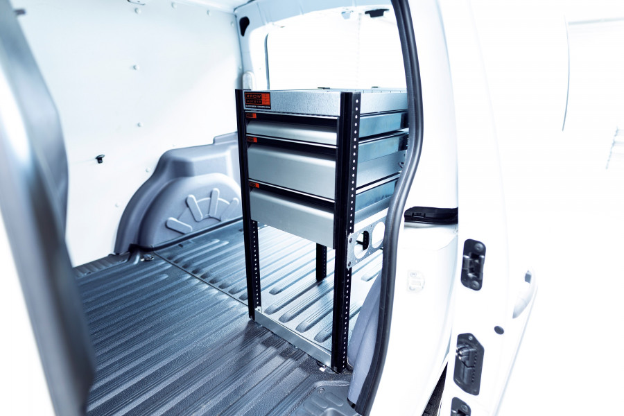 L'un des aménagements les plus populaires pour votre Mercedes Citan, Renault Kangoo & Nissan Townstar L1. L’aménagement avec une profondeur de 420 mm dispose de trois tiroirs de différentes tailles afin de varier les possibilités de rangement. Les tiroirs s’ouvrent facilement depuis la porte latérale coulissante et peuvent supporter une charge uniforme de 35 kg / tiroir. L’espace étagère derrière le bloc tiroir est idéal pour ranger vos mallettes, outils ou consommables mais peut aussi se compléter avec notre système de bacs de rangement sur rails