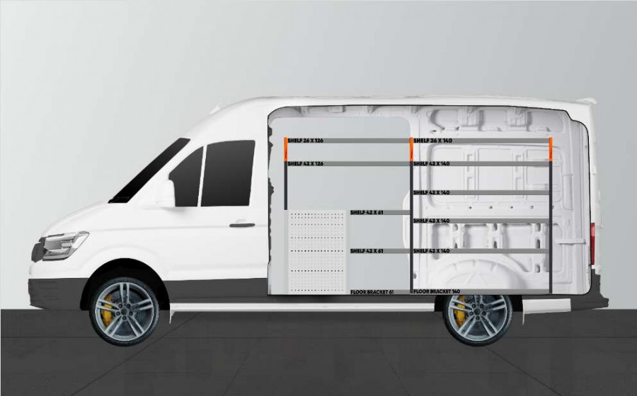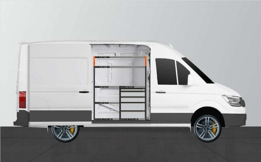 Cet aménagement offre un grand espace de rangement (tiroirs et étagères) pour Man TGE & VW Crafter L3 avec porte latérale gauche. (Retour/échange exclus)