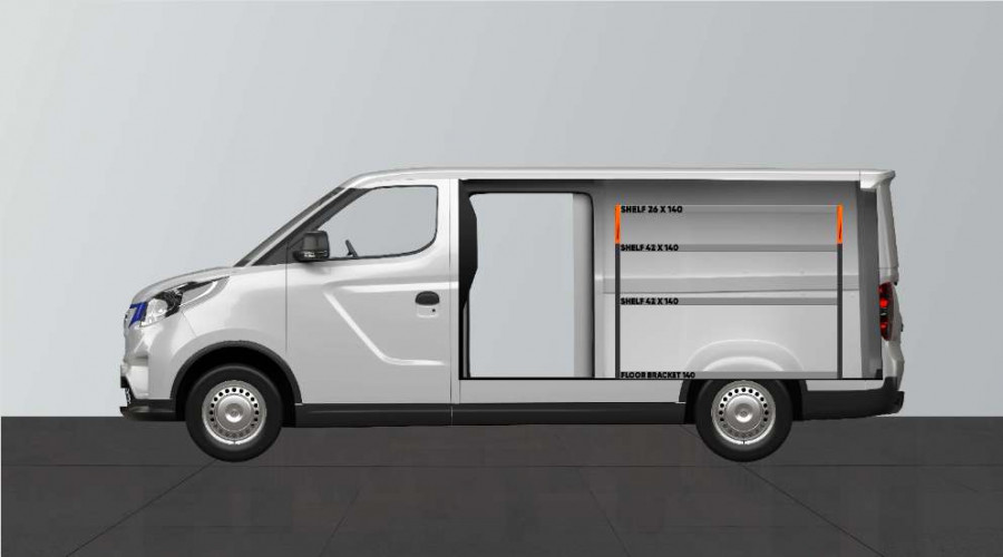 Un aménagement utilitaire un peu plus court pour votre Maxus e-Deliver 3 L2. Avec une profondeur de 420 mm l’aménagement constitue une excellente alternative de rangement pour les mallettes à outils et les outils électriques ainsi que pour les petites pièces. Les étagères de 420 mm de profondeur permettent d’accueillir parfaitement la plupart des mallettes à outils actuellement disponibles sur le marché. L’étagère du haut de 262,5 mm est souvent combinée à nos bacs modulaires pour y ranger les petits objets. L’aménagement est adapté aux véhicules avec ou sans porte latérale et le panneau perforé peut être équipé de nos accessoires Smartbox, crochets, etc.