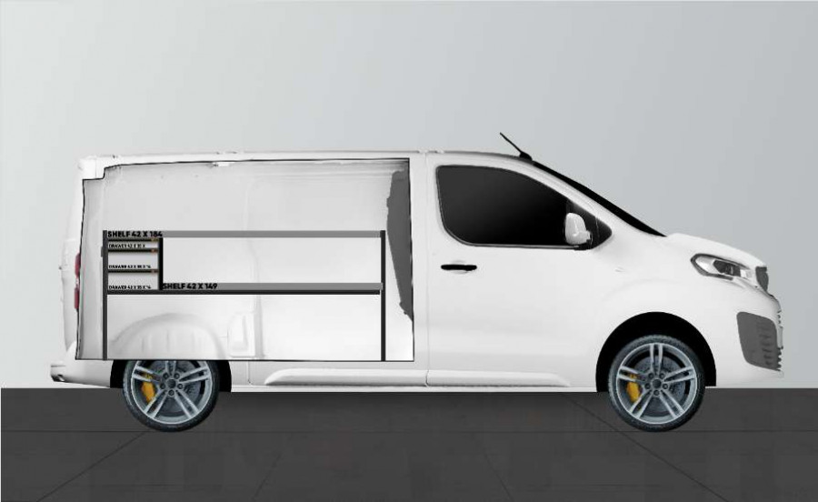 Une solution d’aménagement simple avec tiroirs et étagères pour Expert, Jumpy, Vivaro, Scudo & ProAce L2 très populaire auprès des conducteurs de véhicule de maintenance.