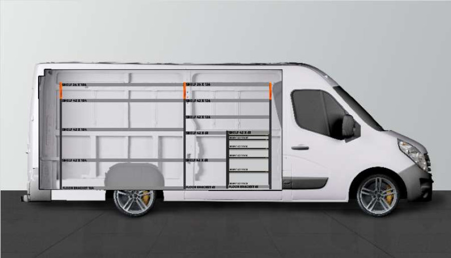 Voici l’un de nos systèmes les plus appréciés des conducteurs de Opel Movano, Renault Master & Nissan NV400. Le chiffre 5 correspond au nombre de tiroirs. Cet aménagement offre également d’excellentes possibilités de rangement dans les étagères, non seulement pour vos mallettes à outils et vos outils électriques mais aussi pour vos petits objets. Vous disposez d’un caisson à tiroirs de tailles différentes pour que chaque article trouve sa place. Les tiroirs avec roulement à billes peuvent être complétés par nos inserts à tiroir pour structurer l’espace de façon optimale. Le panneau perforé peut être équipé de nos accessoires Smartbox, crochets, etc. afin d’optimiser votre espace de rangement.