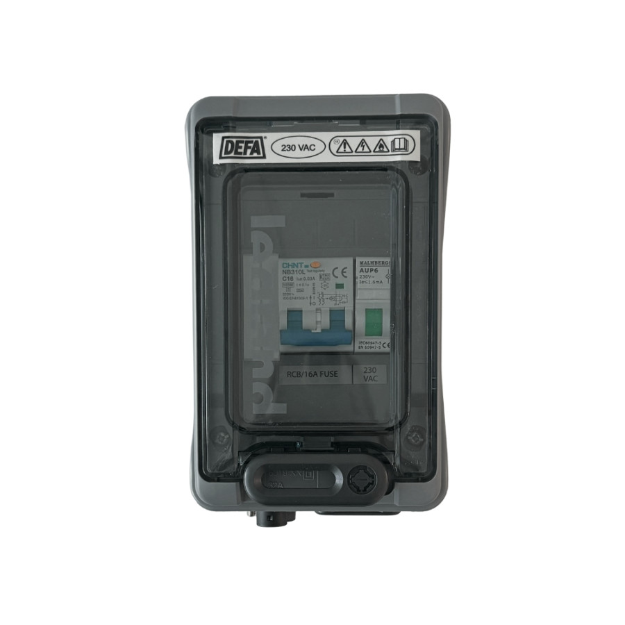 Tableau d’alimentation avec fusible et disjoncteur. Livré par défaut avec une sortie Schuko (prise suédoise standard) et des prises DEFA comme entrée et sortie. Le tableau d’alimentation est conçu pour un fusible de 230 V CA, 16 A. Il contient un « économiseur de zinc » qui réduit la corrosion galvanique des métaux à bord.