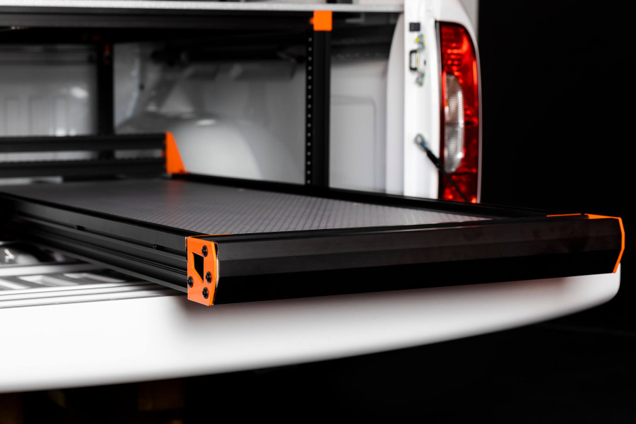 Maximisez la portée à l'intérieur de votre espace de chargement avec un plateau coulissant extensible. Il optimise l'environnement de travail en garantissant que même les charges lourdes telles que les outils peuvent être retirées et soulevées du véhicule d'une manière ergonomique. Le plateau coulissant est fabriqué en aluminium à haute résistance anodisé noir avec des fixations en acier galvanisé et est donc très léger pour réduire l'impact du poids total de la charge. Grâce à un concept totalement modulaire, nous pouvons vous proposer un plateau coulissant adapté à votre véhicule et à vos besoins. Le plateau se retire facilement d'une seule main en appuyant sur la poignée de verrouillage tout en tirant le plateau vers l'extérieur. Des verrous à ressort et plusieurs étapes sur la longueur d'extension garantissent que le plateau coulissant s'arrête rapidement pendant que vous le chargez, même si le véhicule est garé sur une pente. Avec une large gamme d'accessoires, vous pouvez compléter votre plateau coulissant pour un intérieur idéal.
